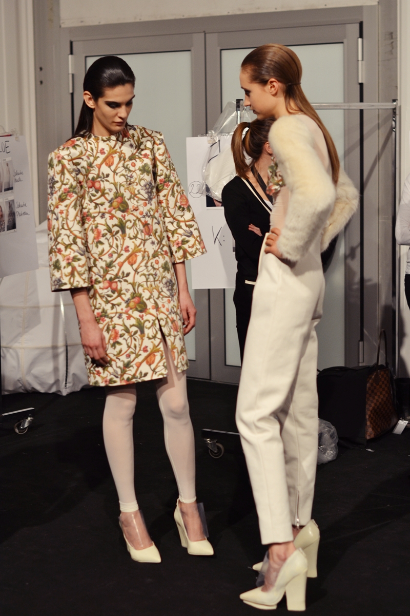 Monday, 14th January – models, the designer and his crew, stylist, assistants, bloggers- everyone is gathering together for the fitting in one of Berlin’s studios. One by one all of the models get their outfits, the designer and stylist decide about the running order, the assistant take pictures for the model boards and bloggers for their blogs. The last decisions were made in chaos and it looks like we’re ready for the show. Tuesday, 15th of January – chaos and hurry backstage at the show. Models getting their makeup and hair done, working on the choreography, complaining about the shoes. Stylists checking the outfits and order. Leandro Cano being excited and nervous about his first show at the Fashion Week. Everything and everyone seems tense, but as soon as we hear the people clapping their hands we feel relieved. Next: congratulations and interviews. The show is over!