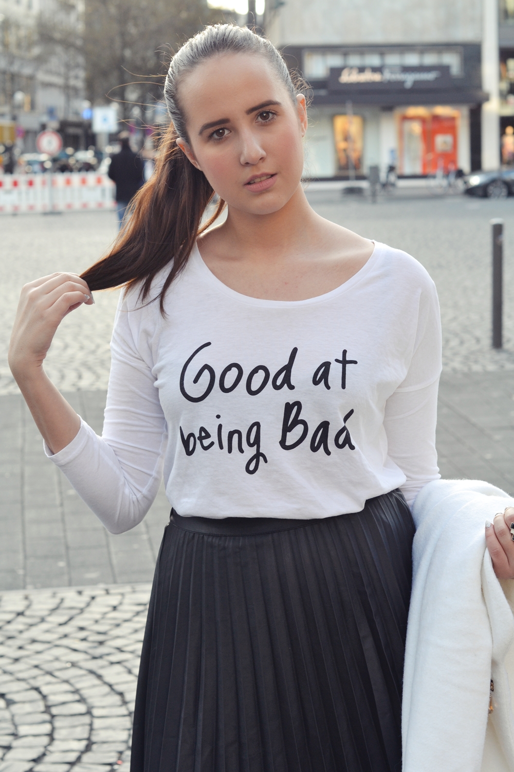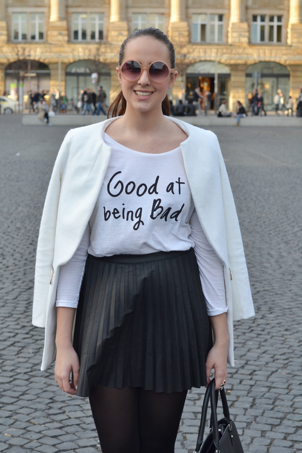 Nachdem ich ein paar Outfits gepostet habe, die ein komplettes Experiment waren, ist heute wieder die Zeit für ein Outfit in meinem Still. Einfach aber elegant, gewöhnlich und dezent aber schick. Ich habe mich für einen Faltenrock in Lederoptik entschieden, dazu schwarze Schuhe, weißer Mantel und ein pfirsich Akzent in Form von meinen Sonnenbrillen. Ich muss sagen, dass das simple Outfit sehr viele Blicke in Frankfurt an sich gezogen hat, als ich an den Leuten vorbeigelaufen bin. Bisschen lustig.